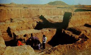 咸阳是战国晚期秦国和秦代的都城。遗址位于今咸阳市区东15公里,南临渭水,北距台塬,现存面积约20万平方公里。 遗址中部偏北的"北坂"一带,发现了周长2747的宫城墙基。宫城内外,已探明建筑基址20余处,发掘了属高台建筑的一、二、三号宫殿遗址。一号宫殿基址平面呈"凹"字形,长177米,宽45米;夯土台基高出地面6米,分为上下两层。上层正中为主体宫殿,周围及下层分别为卧室,盥洗室,沐浴室,室内墙上绘制壁画。宫城以外,还有著名的阿房宫,兰池宫,望夷宫等遗址。遗址内,还发现了长近千米的宽阔道路,以及冶铸,制陶,制骨等作坊遗址,发掘灰坑100多处,水井70余口。出土遗物以砖瓦等建筑材料为主,还有铁器,铜器,兵器,货币和陶器等,其中不少砖瓦和陶器上戳印有篆、隶体陶文,是研究秦都咸阳的珍贵文字资料。