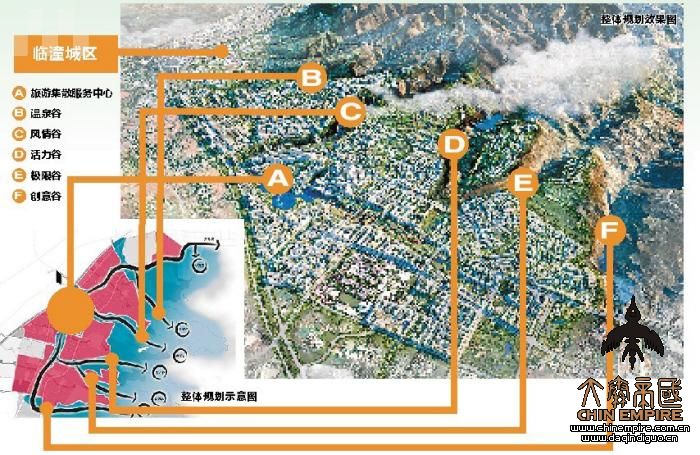 横向四大组团+中心区——从横向上(南北向),根据现状及自然地理条件(沟谷的分割),划分为四大组团并形成各自主题,从北至南依次为温泉休疗及教育组团、风情小镇度假组团、活力度假组团和创意生活组团。同时,在整个度假区的核心位置安排服务中心,既是生活服务中心也是旅游集散服务中心。
