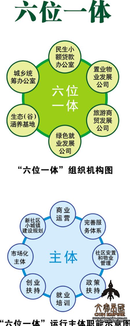 “六位一体”:组建城乡统筹办公室,为政府派出机构,负责政策制定和规划、建设的指导工作;注资2000万元,成立绿色就业公司,负责承揽绿色产业项目,对新居民进行就业培训和安排就业;注资2000万元,成立社区置业物业公司,具体负责社区物业的投资、管理和运营工作;注资5000万元,成立旅游商贸公司,配套建设临潼旅游商贸大市场,繁荣旅游商贸产业,吸引社会资本和个人创业投资,为广大新居民拓展致富增收的可靠渠道,解决物业管理、社区服务经费难题。同时,开工建设凤凰池生态(谷)涵养基地,成为新居民培训基地、实习基地和就业基地;注资1亿元,成立民生小额贷款办公室,解决新居民创业融资难题。