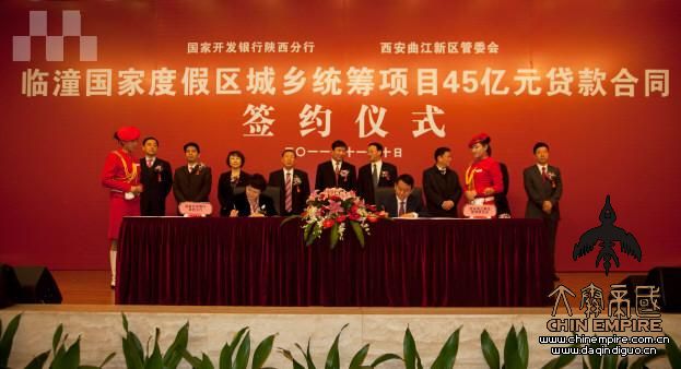 11月10日,国家开发银行陕西分行与曲江新区管委会举行了“临潼国家度假区城乡统筹项目45亿元贷款合同签约仪式”,这是国开行全国城乡统筹最大的一笔放贷资金,也是国开行2011年度最大的一笔单项贷款。西安市副市长段先念、黄海清等相关领导出席了签约仪式。